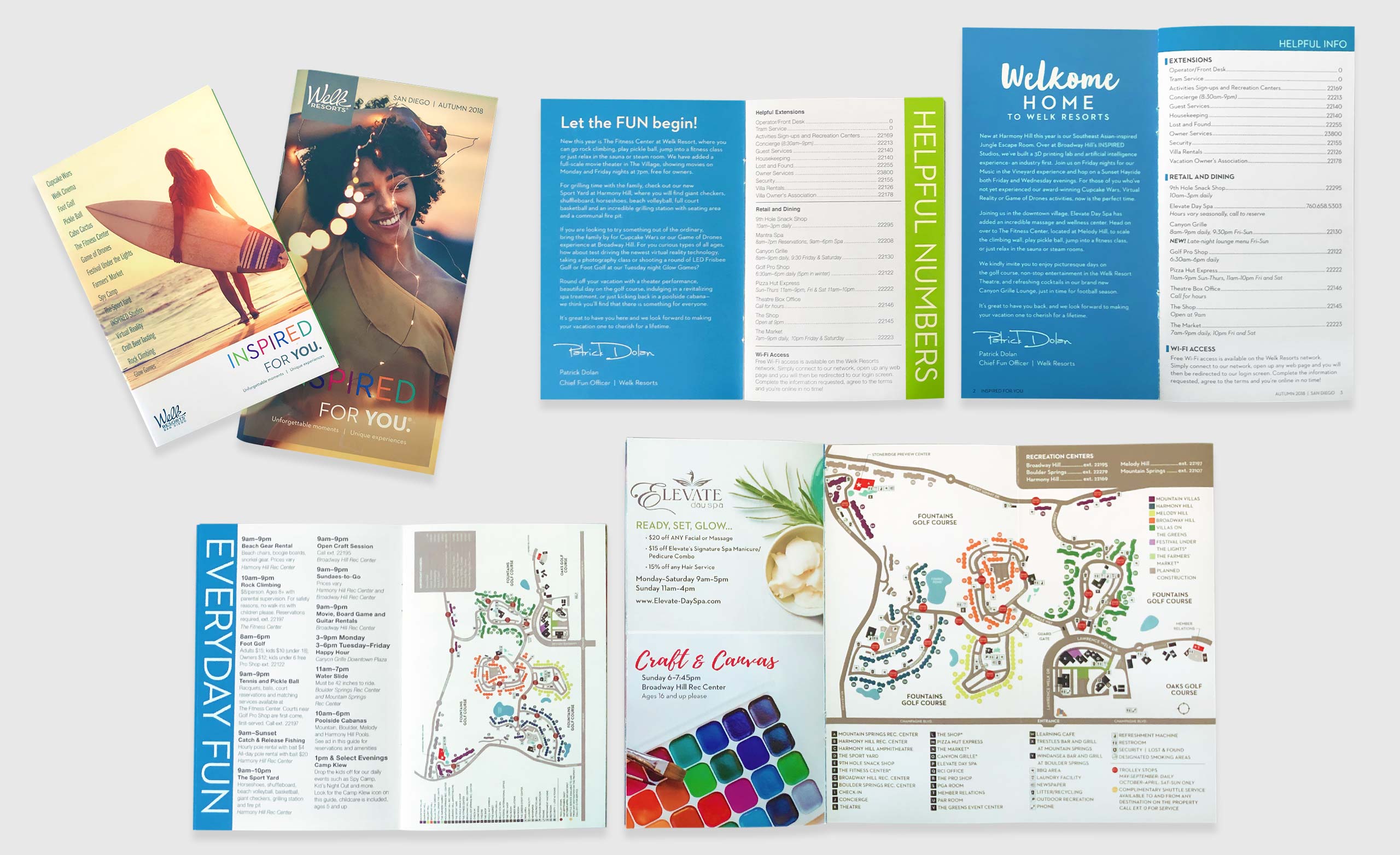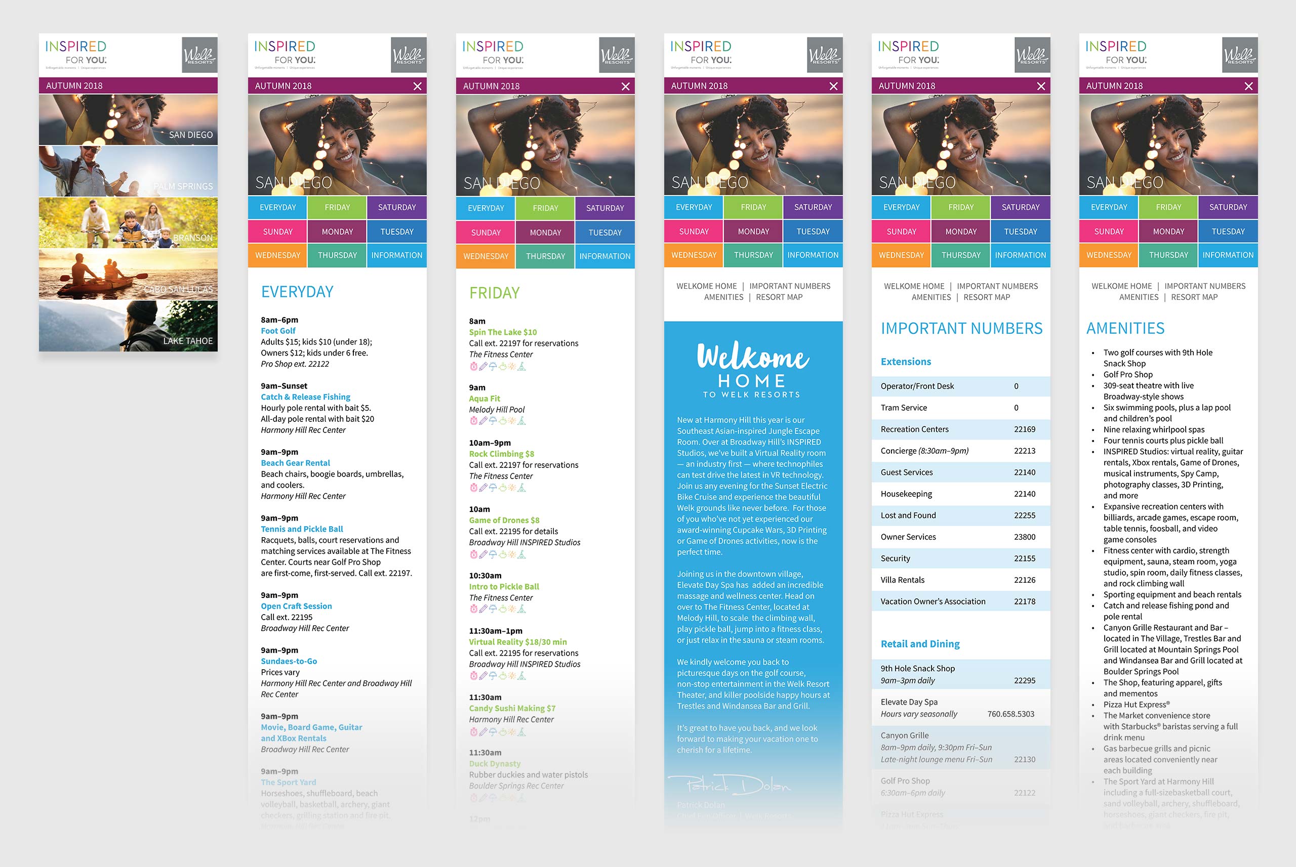 Five times a year, the INSPIRED FOR YOU program releases a printed guide/brochure for all locations and their daily activities. Each guide also contains pertinent resort information (e.g., important phone numbers, hours of operation, check-in/check-out times, room amenities). These guides have high-visibility as they are available at the Front Desk and all the on-property recreational centers. The initial guides were small and jam-packed with information that was hard to see or read. In addition, printing these guides was very costly. A user-friendly, clearer, concise, and visually cohesive solution was needed to increase user engagement and activity reservations. In addition, a solution for decreasing printing cost for the stakeholder was of high importance.
